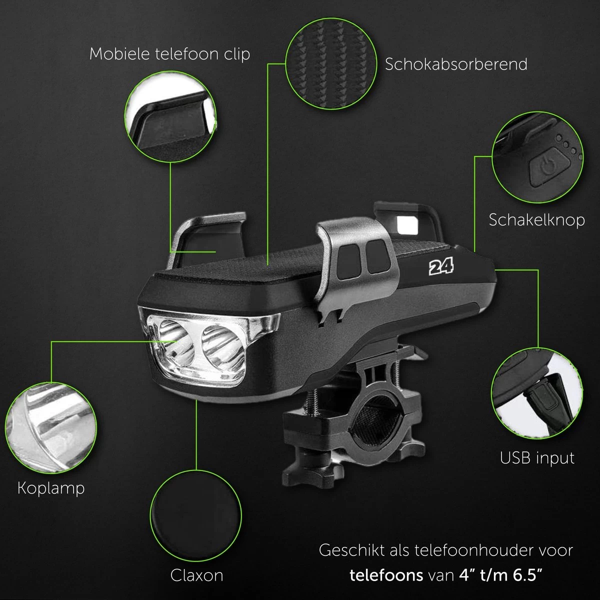 Meest complete fietsverlichting mét telefoonhouder, toeter, powerbank én oplaadbaar via usb – wat wil je nog meer?