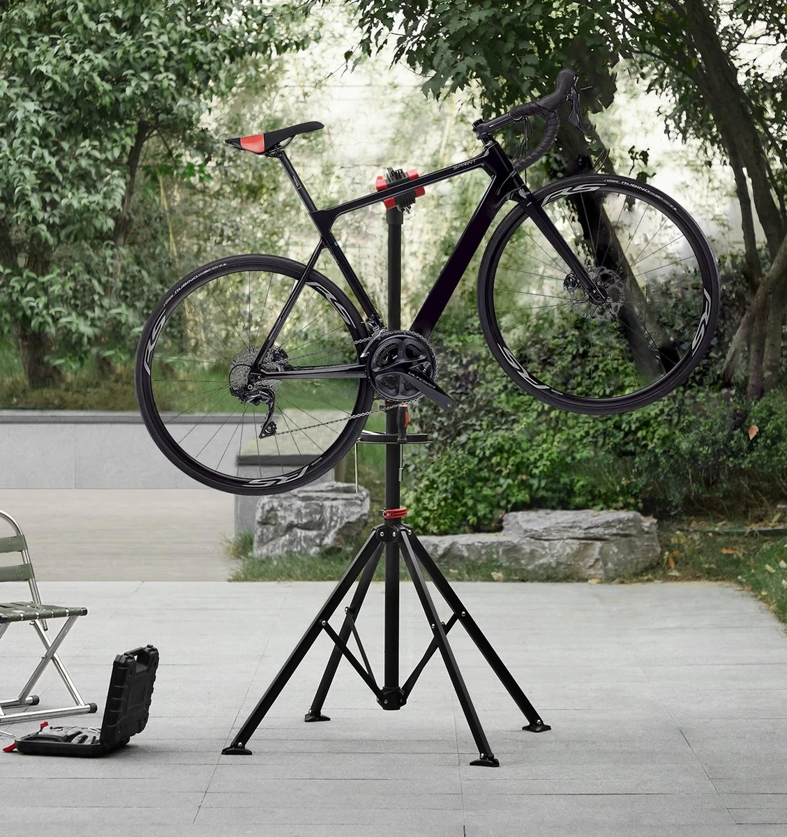 Je kan de fietsstandaard uitschuiven van 101 tot 171 cm hoog, waardoor je zonder problemen aan je fiets kan werken.