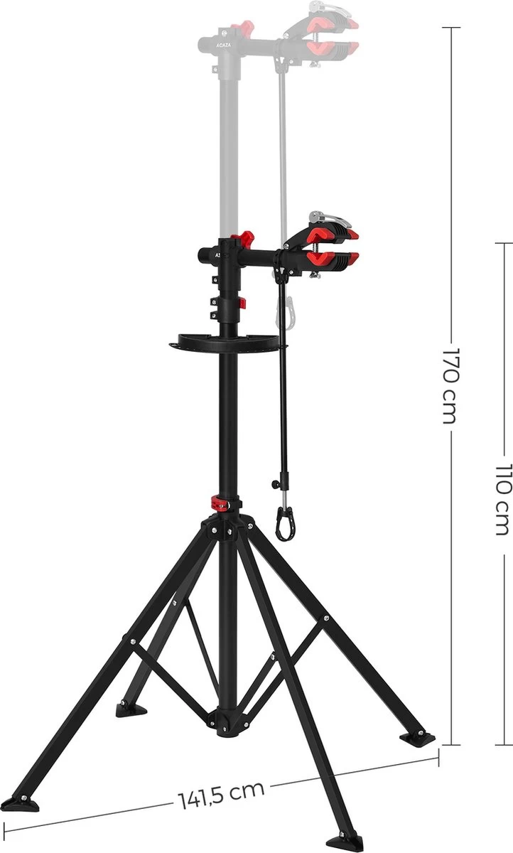 – Afmetingen: de fiets montagestandaard is 141 cm breed; de hoogte is van 101 tot 171 cm