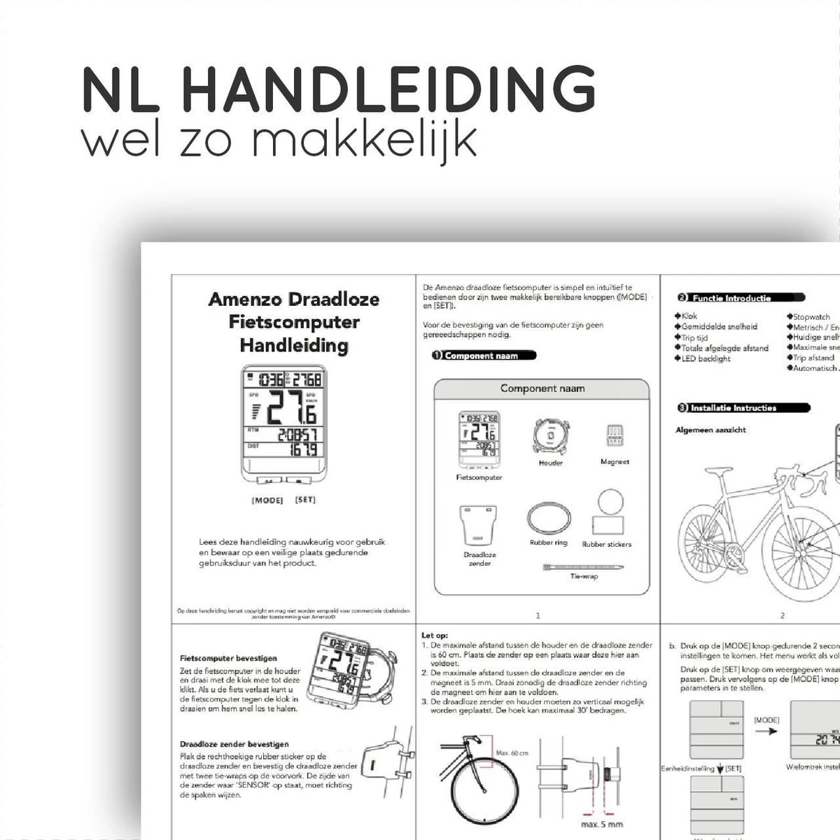 Bij de Amenzo Draadloze Fietscomputer is een online Nederlandse handleiding beschikbaar zodat u snel en gemakkelijk aan de slag kunt met uw fietscomputer. U kunt de handleiding downloaden of online bekijken door in uw browser naar de volgende link te gaan: https://pdfhost.io/v/rMBdxB.XD_Amenzo_Fietscomputer_Handleiding.pdf