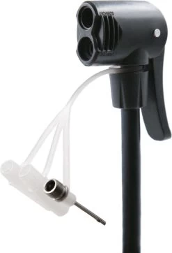 Voordeel van zo’n dubbel ventiel is dat je geen aparte verloopnippels nodig hebt voor deze veelvoorkomende ventielsoorten. Je klemt de pompkop vast over het ventiel met een hendeltje.