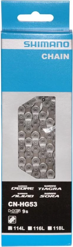 | Verpakkingsinhoud | Ketting Shimano HG53 9V 11/128" Zilver 116 Sch. |