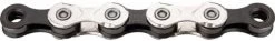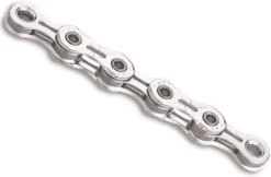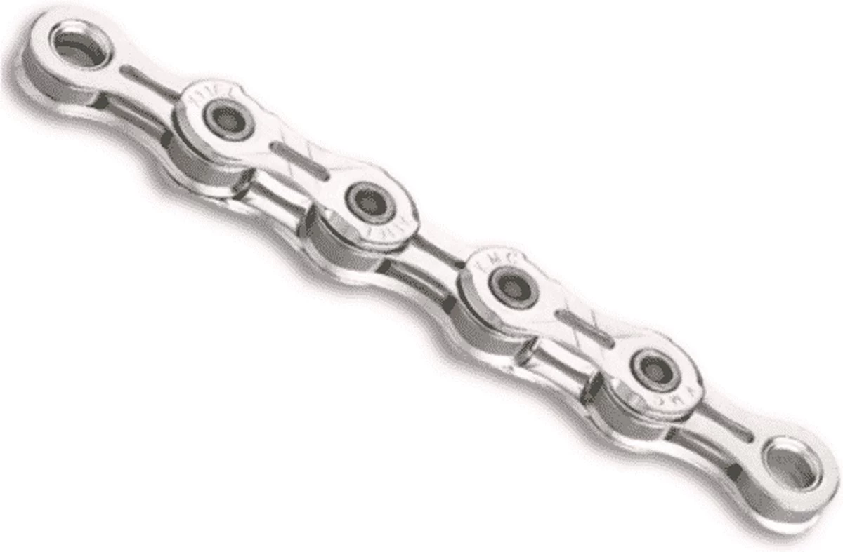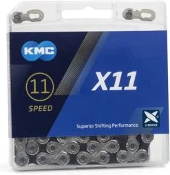 De KMC X11EL. EL staat voor extra light. De ketting is namelijk gemaakt van een titanium nitride coating. Deze harde laag zorgt voor een slijtvaste ketting, licht gewicht en snel schakelen. En is de opvolger van de KMC X11 L uitvoering.Lage verzendkosten kettingVerzendkosten één ketting NL: €4,90Boven €49,- geen verzendkosten!Kettingen kunnen geleverd worden in oem bulkverpakking.Alle KMC kettingen zijn door de bijgeleverde ‘missinglink’ eenvoudig met de hand te monteren en te demonteren. Ook voor ATB.Optisch gezien is de kleur bijzonder, maar ook de open gewerkte binnenschalen.Vanwege zijn gebruiksgemak, laag gewicht, zachte en snelle schakelen en slijtvastheid staat de KMC X11EL Silver bekend als het meest hoogwaardige ketting ter wereld. Een stap verder gaat de KMC X11SL (), hierbij zijn ook de pennen uitgefreesd. KMC X11 EL Silver:- Compitabel voor alle Shimano, Campagnolo en SRAM 11 Speed groepen.- Inclusief Silver missing link- 118 kettingschakels- Vederlicht: slechts 245g- Uitgevreesde gleuven in de schakels.- Eenvoudig demonteren en monteren- Snel schakelen- Slijtvast- Titanium coating