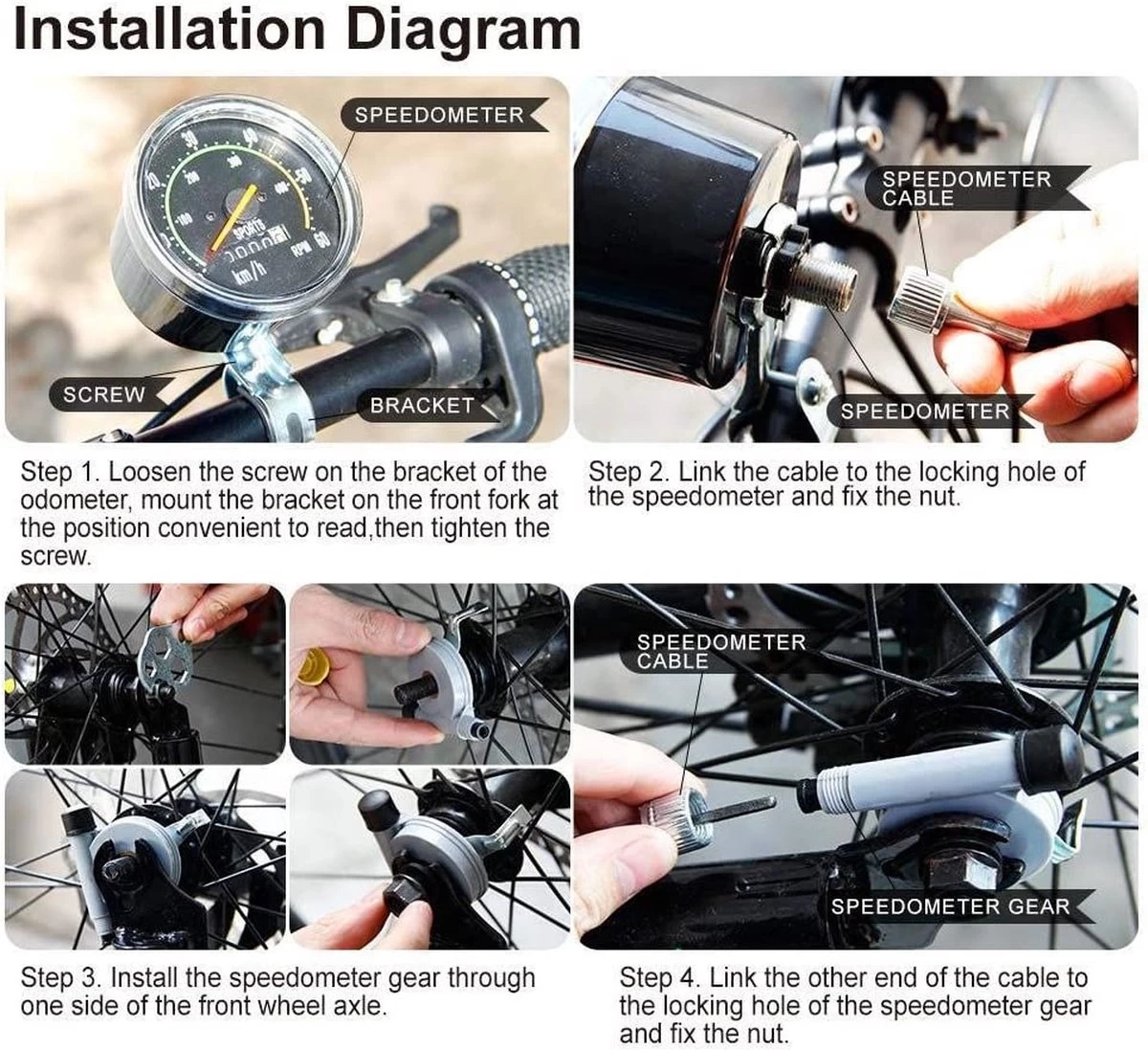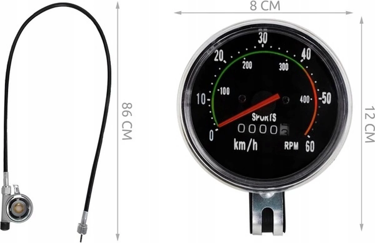 De teller wordt aangedreven door een kabel die verbonden is het as van je voorwiel. Het uiteinde van de worm is aan het meganisme gehaakt en wanneer het wiel draait, begint het wormwiel en de kabel te draaien en laat het mechanisme werken. De teller toont een snelheid tot 60 km/u en het totaal aantal afgelegde kilometers. Terwijl de wijzer van links naar rechts beweegt, moet de montage aan de rechterkant van het wiel worden uitgevoerd.