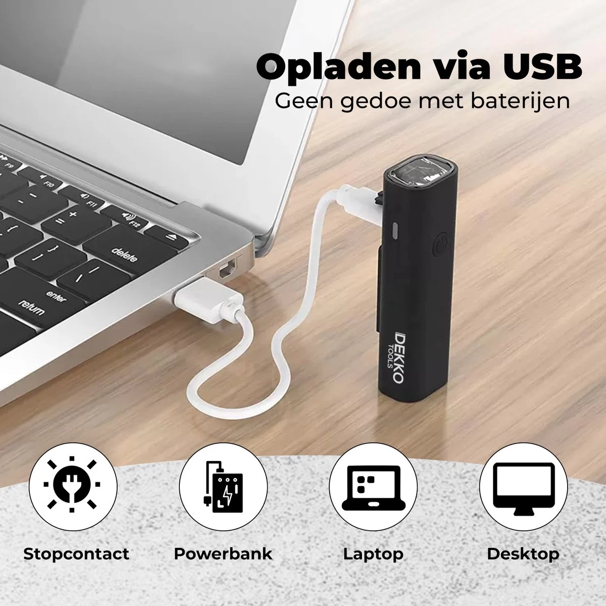 Met de Dekko Tools fietslamp hoef je geen batterijen meer te vervangen. De lampjes zijn namelijk eenvoudig op te laden met de bijgeleverde USB-kabels. Deze kabels passen op elk apparaat met een USB-poort. De oplaadindicatie (rood/groen) vertelt je op tijd wanneer de batterijen bijna leeg zijn. Zo kan je ze niet alleen thuis, maar ook op kantoor of bij vrienden opladen. De voorlamp is in 5 uur volledig opgeladen en 3,5 – 9 uur te gebruiken, afhankelijk van de lichtstand. De achterlamp is in 1,5 uur opgeladen en 3,5 -12 uur te gebruiken.