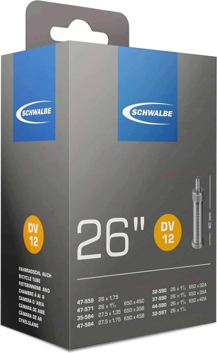 – 1x Schwalbe Binnenband – DV12 – 26 inch x 1 1/4 – 27.5 inch x 1.75 – Hollands Ventiel – 40mm