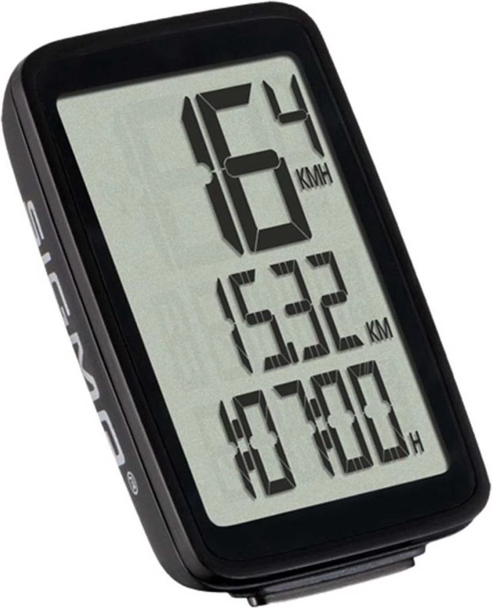 De Sigma Pure 1 fietscomputer met draad heeft 5 functies en een groot display.