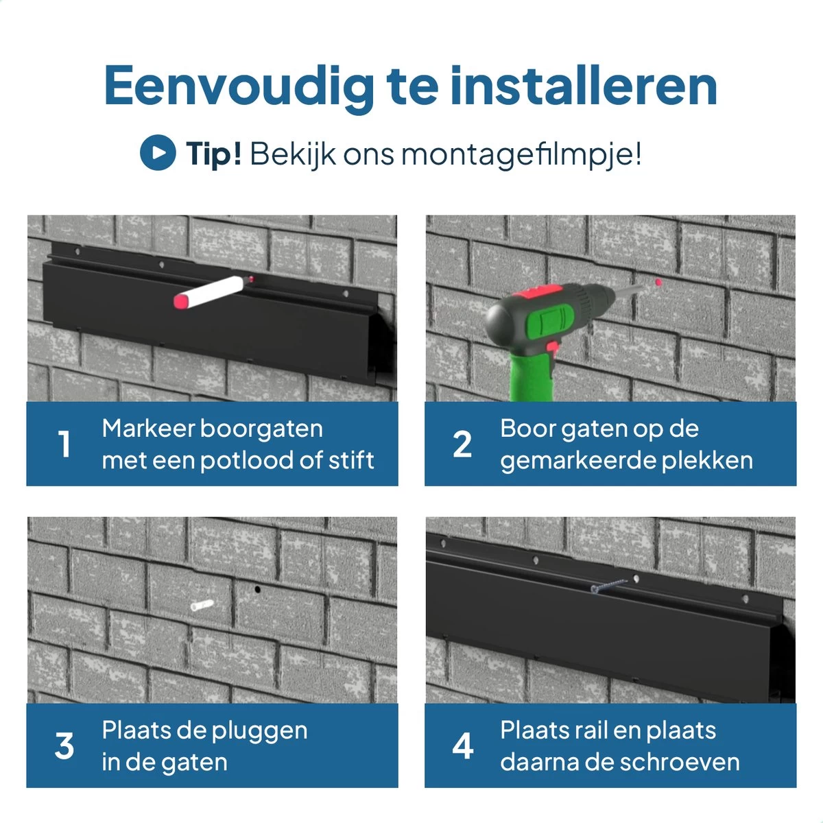 De rails kunnen eenvoudig bevestigd worden door middel van de meegeleverde, stevige pluggen en schroeven.